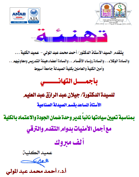 تهنئة للسيدة الدكتورة: جيلان عبد الرازق عبد العليم بمناسبة تعيين سيادتها نائباً لمدير وحدة ضمان الجودة والاعتماد بكلية الصيدلة.