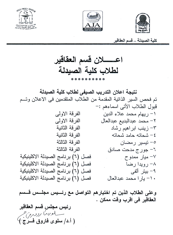 نتيجة إعلان التدريب الصيفي لطلاب كلية الصيدلة بقسم العقاقير بالكلية. 6 يونيو 2017 نتيجة إعلان التدريب الصيفي لطلاب كلية الصيدلة بقسم العقاقير بالكلية.