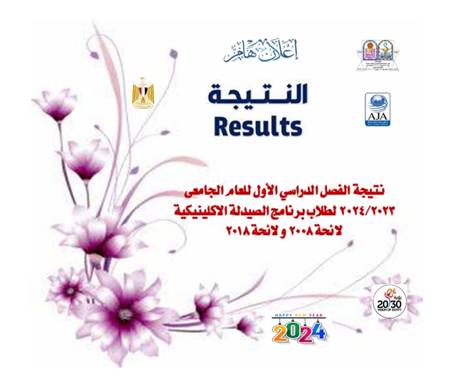 نتيجة الفصل الدراسي الأول للعام الجامعى 2024/2023 لطلاب برنامج الصيدلة الاكلينيكية لائحة 2008 و لائحة 2018 31 يناير 2024 اضغط ? اضغط لدخول إلى نتيجة لائحة 2008 اضغط ? اضغط لدخول إلى نتيجة لائحة 2018