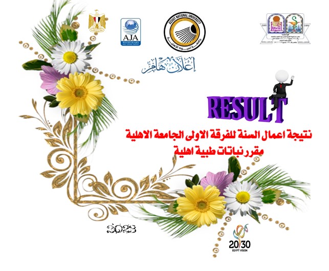 نتيجة اعمال السنة للفرقة الاولى الجامعة الاهلية مقرر نباتات طبية اهليةانه تقرر فتح باب الالتماس يوم الأحد الموافق ٣- ١٢ - ٢٠٢٣ الساعة الثانية ظهرا 30 نوفمبر 2023 اضغط للدخول ? كشف درجات أعمال سنة لمقرر "نباتات طبية"