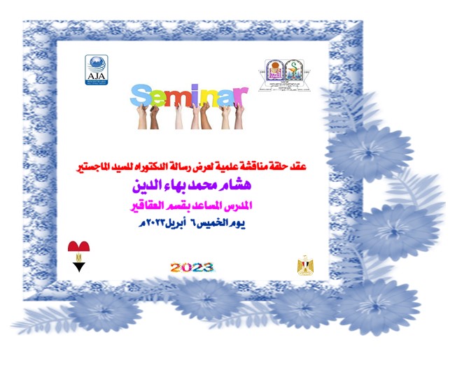 سيتم بإذن الله عقد حلقة مناقشة علمية لعرض رسالة الدكتوراه للسيد الماجستير / هشام محمد بهاء الدين – المدرس المساعد بالقسم تحت عنوان:-