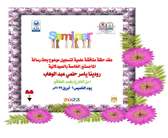 سيتم بإذن الله عقد حلقة مناقشة علمية لتسجيل موضوع بحث رسالة الماجستير الخاصة بالصيدلانيه/ رودينا ياسر حلمي عبد الوهاب (من الخارج) وذلك لنيل درجة الماجستير فى العلوم الصيدلية (عقاقير) تحت عنوان:-