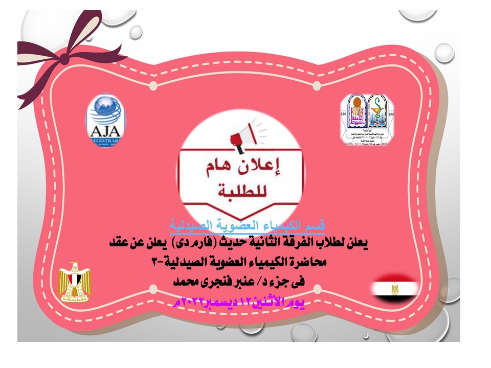 قسم الكيمياء العضوية الصيدلية لطلاب الفرقة الثانية حديث (فارم دى) يعلن عن عقد محاضرة الكيمياء العضوية الصيدلية-3 فى جزء د/ عنبر فنجرى محمد – يوم الأثنين 12 ديسمبر2022م