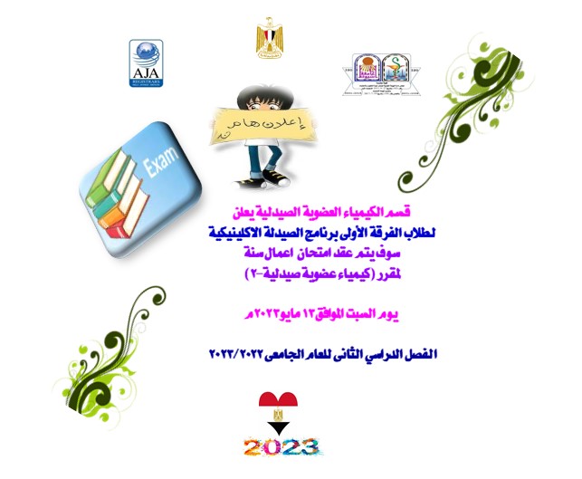 قسم الكيمياء العضوية الصيدلية يعلن لطلاب الفرقة الأولى برنامج الصيدلة الاكلينيكية سوف يتم عقد امتحان اعمال سنة لمقرر (كيمياء عضوية صيدلية-2) يوم السبت الموافق 13 مايو 2023م