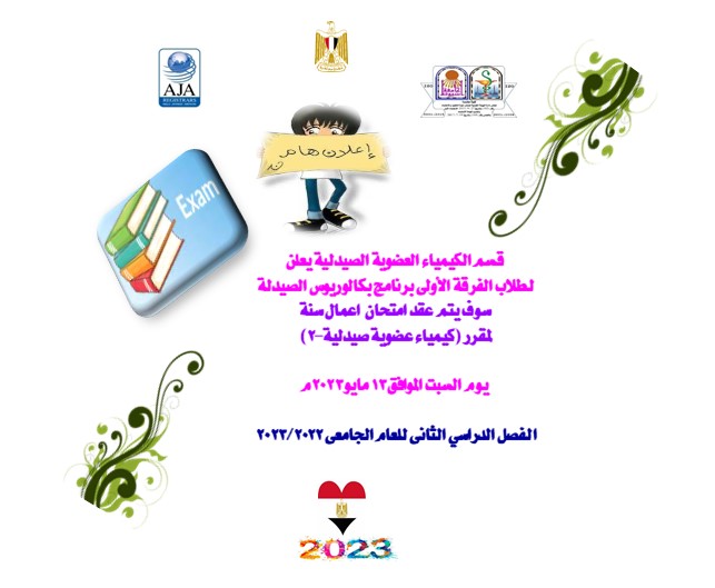 قسم الكيمياء العضوية الصيدلية يعلن لطلاب الفرقة الأولى برنامج بكالوريوس الصيدلة سوف يتم عقد امتحان اعمال سنة لمقرر (كيمياء عضوية صيدلية-2) يوم السبت الموافق 13 مايو 2023م