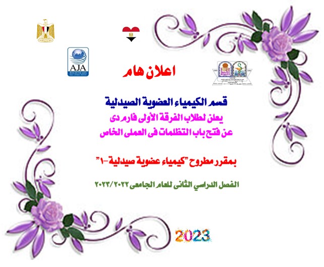 قسم الكيمياء العضوية الصيدلية يعلن لطلاب الفرقة الأولى فارم دى عن فتح باب التظلمات فى العملى الخاص بمقرر مطروح "كيمياء عضوية صيدلية-1" 8 مايو 2023