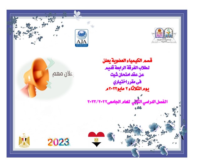 قسم الكيمياء العضوية الصيدلية يعلن لطلاب الفرقة الرابعة قديم عن عقد امتحان شيت فى مقرر اختياري يوم االثلاثاء 2 مايو 2023م 18 أبريل 2023