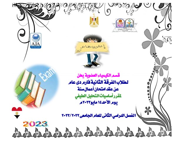 قسم الكيمياء العضوية الصيدلية يعلن لطلاب الفرقة الثانية فارم دى عام عن عقد امتحان أعمال سنة لمقرر أساسيات التحليل الطيفي يوم الأحد 14 مايو 2023م 2 مايو 2023