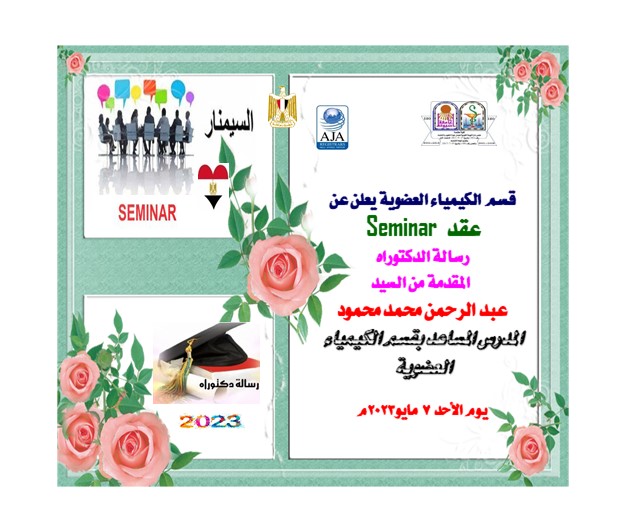 قسم الكيمياء العضوية يعلن عن عقد Seminar رسالة الدكتوراه المقدمة من السيد/ عبد الرحمن محمد محمود -المدرس المساعد بالقسم 2 مايو 2023