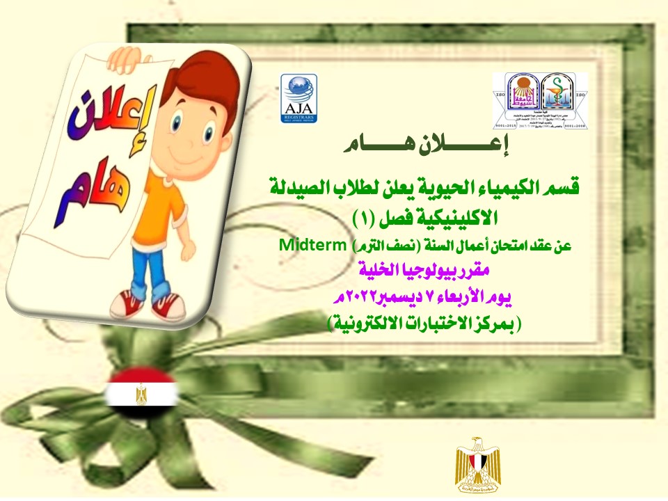 قسم الكيمياء الحيوية يعلن لطلاب الصيدلة الاكلينيكية فصل (1) عن عقد امتحان أعمال السنة (نصف الترم) Midterm مقرر بيولوجيا الخلية يوم الأربعاء 7 ديسمبر2022م (بمركز الاختبارات الالكترونية)