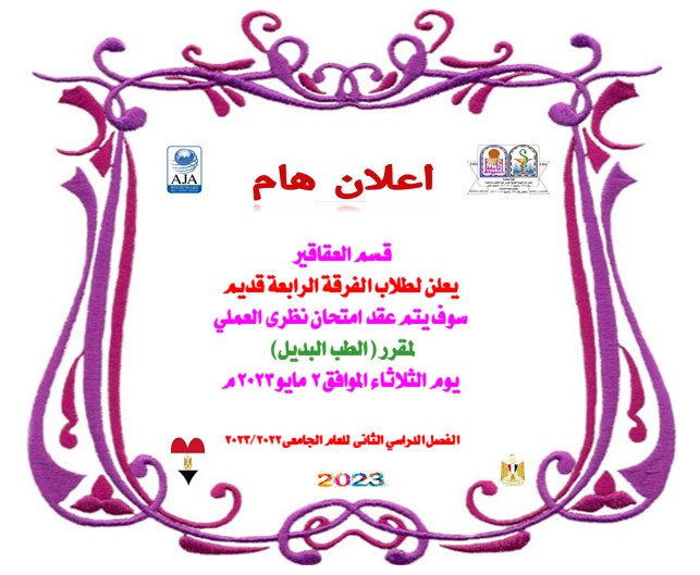 قسم العقاقير يعلن لطلاب الفرقة الرابعة قديم سوف يتم عقد امتحان نظرى العملي لمقرر (الطب البديل) يوم الثلاثاء الموافق 2 مايو 2023م 1 مايو 2023