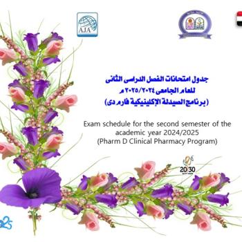 الجدول النهائى لإمتحانات الفصل الدراسى الثانى للعام الجامعى 2024/2025م (برنامج الصيدلة الإكلينيكية فارم دى بعد التعديل)