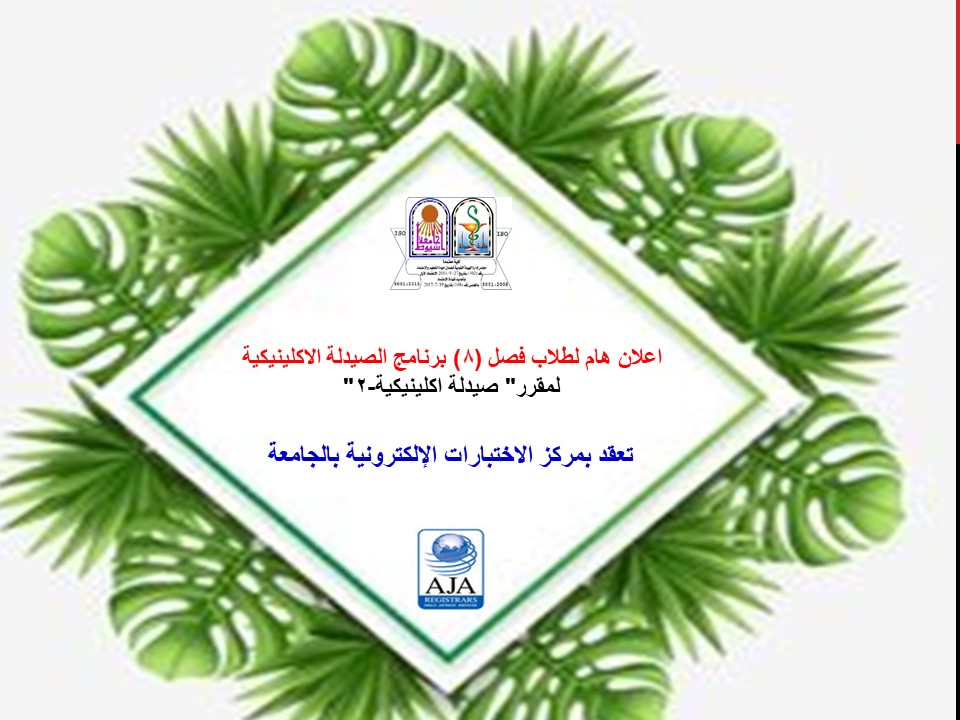 (تعديل) اعلان هام لطلاب فصل (8) برنامج الصيدلة الاكلينيكية من يوم الخميس الموافق 14 أبريل إلى 27 أبريل 2022 لمقرر" صيدلة اكلينيكية-2" من 3 عصراً 24 أبريل 2022 اضغط قائمة أسماء طلاب فصل (8) برنامج الصيدلة الاكلينيكية مقرر " صيدلة اكلينيكية-2"