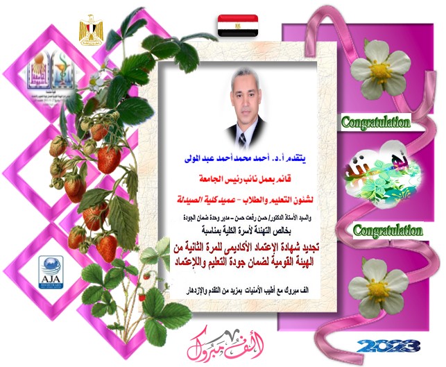 تهنئة لأسرة كلية الصيدلة بمناسبة تجديد شهادة الاعتماد الأكاديمى للمرة الثانية من الهيئة القومية لضمان جودة التعليم والإعتماد 22 يونيو 2023