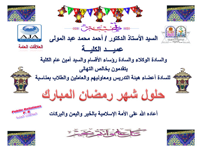 يتقدم السيد الأستاذ الدكتور- عميد الكلية والسادة الوكلاء ورؤساء الأقسام بخالص التهانى إلى أعضاء هيئة التدريس والعاملين والطلبة والطلبات بمناسبة حلول شهر رمضان الكريم أعاده الله على الأمة الإسلامية بالخير والبركات،،،