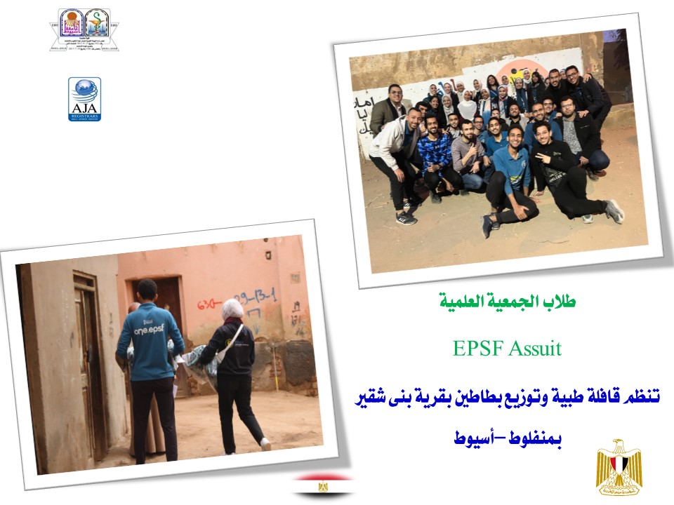 تحت رعاية السيد الأستاذ الدكتور / أحمد المنشاوى – القائم بأعمال رئيس الجامعة ، و السيد الأستاذ الدكتور / أحمد محمد عبدالمولى – عميد الكلية والقائم بأعمال نائب رئيس الجامعة لشئون التعليم والطلاب و تحت إشراف السيد الأستاذ الدكتور / حسن رفعت حسن – وكيل الكلية لشئون التعليم والطلاب و السيد الأستاذ الدكتور / محمد محمود عبد اللطيف – وكيل الكلية لشئون خدمة المجتمع وتنمية البيئة و السيدة الدكتورة / نرمين العراقى – الأستاذ المساعد بقسم الصيدلانيات و رائد الجمعية العلمية لطلاب كلية الصيدلة نظم طلاب الجمعية العلمية لطلاب كلية الصيدلة جامعة أسيوط (Assuit EPSF ) قافلة طبية وتوزيع عدد 150 بطانية على الفئات الأكثر إحتياجاً بقرية بنى شقير بمنفلوط – أسيوط