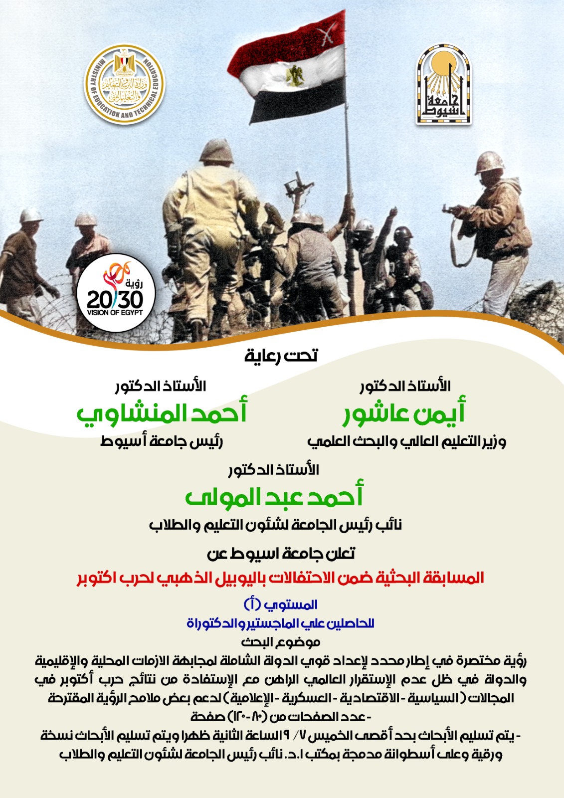 تعلن جامعة اسيوط عن المسابقة البحثية للحاصلين على الماجستير و الدكتوراه 27 أغسطس 2023 تعلن جامعة اسيوط عن المسابقة البحثية ضمن الاحتفالات باليوبيل الذهبى لحرب اكتوبر للحاصلين على الماجستير و الدكتوراه