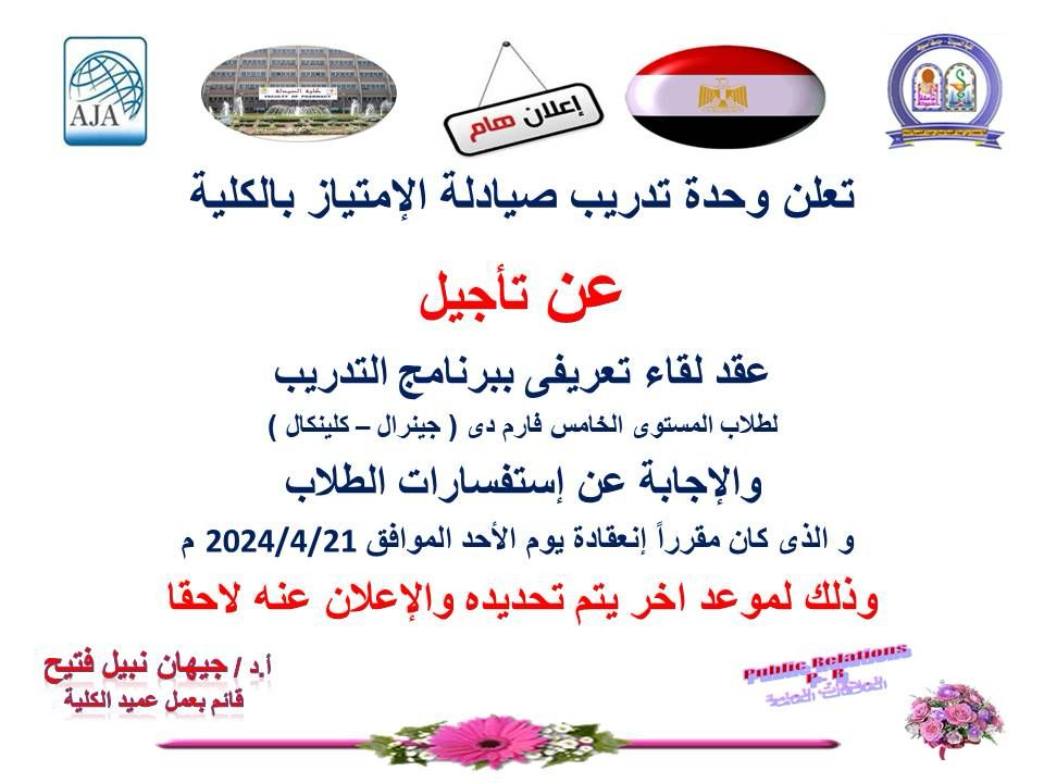 تعلن وحدة تدريب صيادلة الإمتياز بالكلية عن تأجيل عقد لقاء تعريفي ببرنامج التدريب لطلاب المستوى الخامس فارم دي 17 أبريل 2024