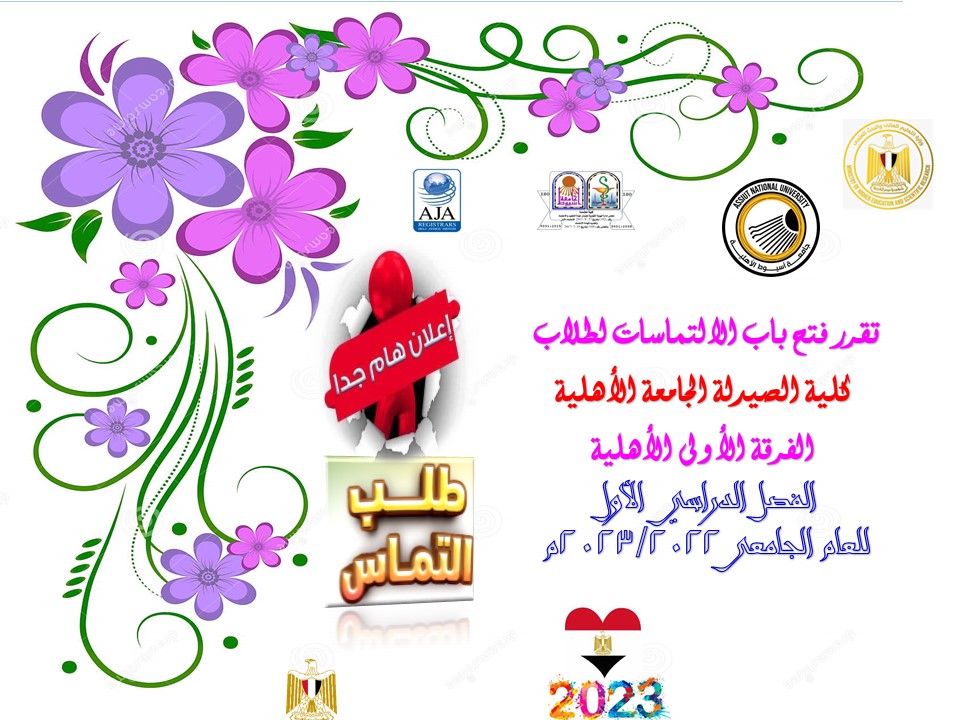 تقرر فتح باب الالتماسات لطلاب كلية الصيدلة الجامعة الأهلية الفرقة الأولى الأهلية الفصل الدراسي الأول للعام الجامعى 2023/2022م 1 فبراير 2023