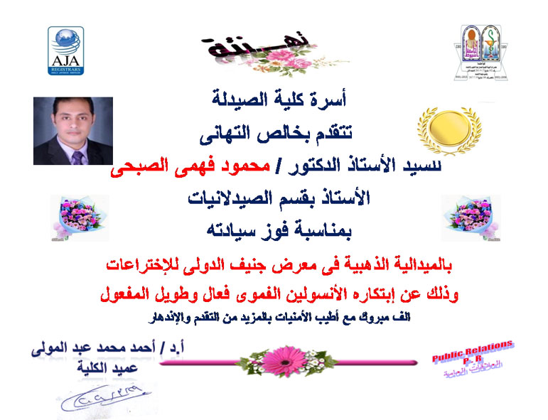 تتقدم أسرة كلية الصيدلة بخالص التهانى للسيد الأستاذ الدكتور/ محمود فهمى الصبحى - بفوز سيادته الميدالية الذهبية فى معرض جنيف الدولى للأختراعات 31 مارس 2021