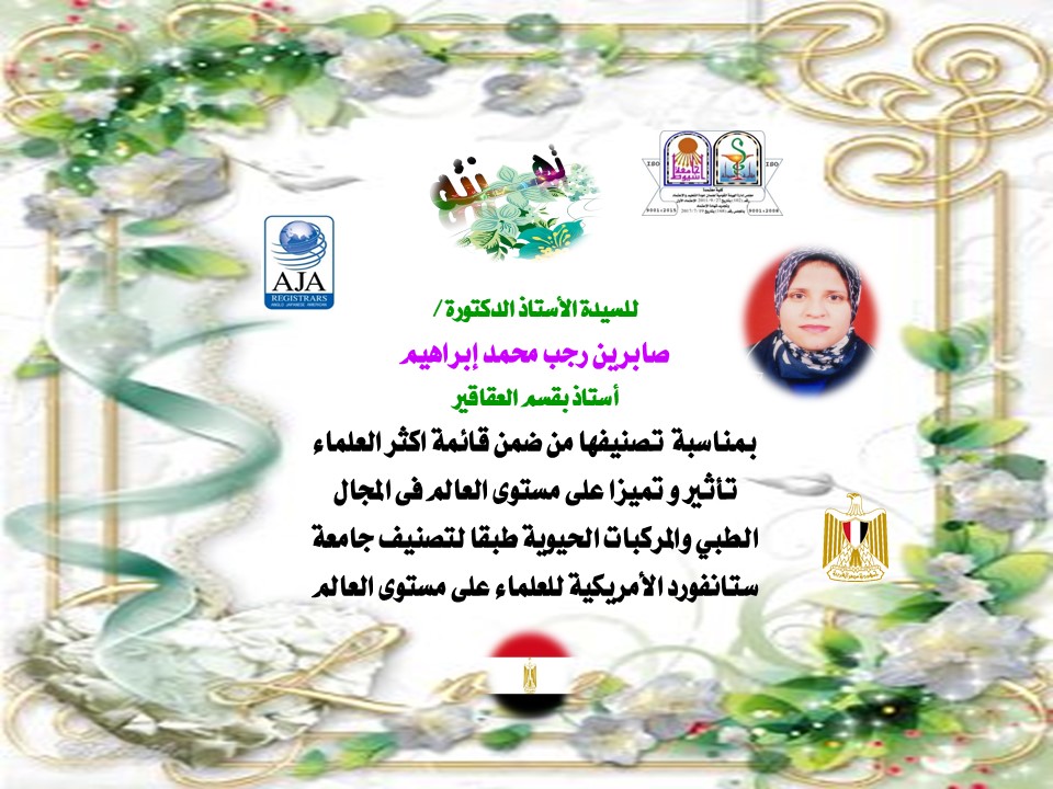 تتقدم أسرة كلية الصيدلة بخالص التهاني للسيدة الأستاذ الدكتورة / صابرين رجب محمد إبراهيم - أستاذ بقسم العقاقير بمناسبة - تصنيفها من ضمن قائمة اكثر العلماء تأثير و تميزا على مستوى العالم فى المجال الطبي والمركبات الحيوية طبقا لتصنيف جامعة ستانفورد