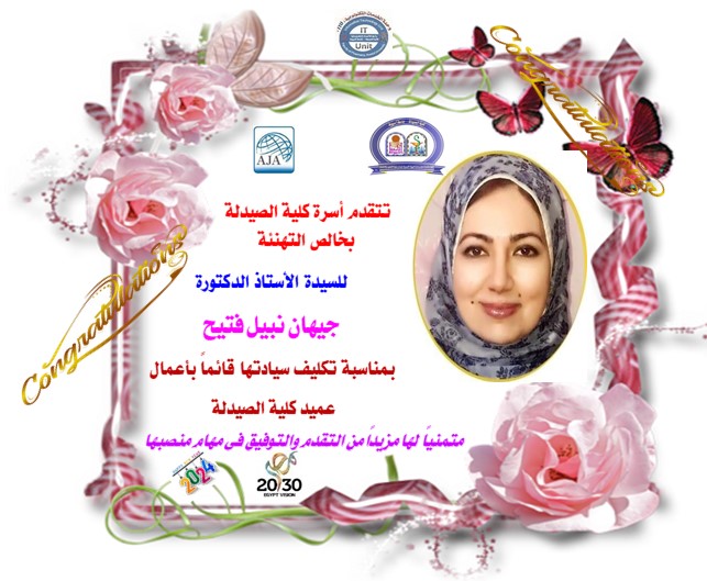 تتقدم أسرة كلية الصيدلة بخالص التهنئة للسيدة الأستاذ الدكتورة/ جيهان نبيل فتيح - بمناسبة تكليف سيادتها قائماً بأعمال عميد كلية الصيدلة 7 فبراير 2024