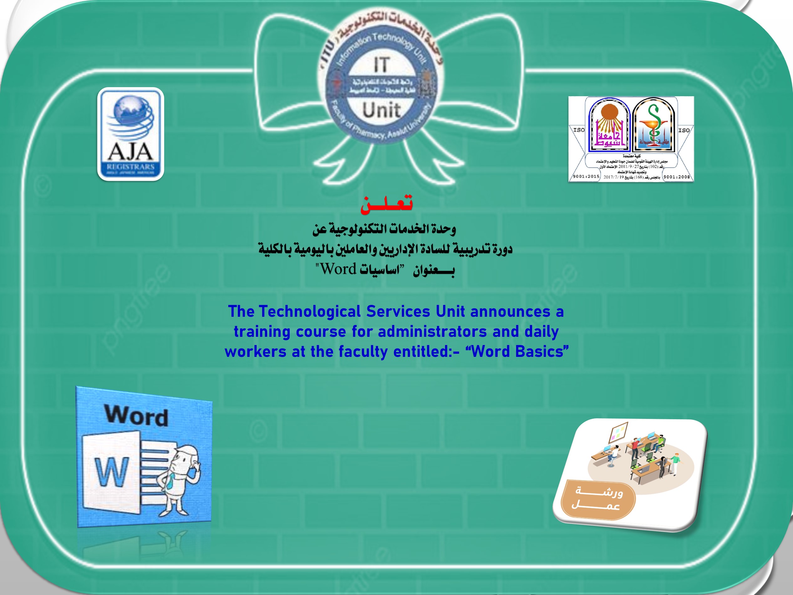 وحدة الخدمات التكنولوجية عن دورة تدريبية للسادة الإداريين والعاملين باليومية بالكلية بـــــعنوان:- " اساسيات Word "وذلك يومى الثلاثاء والاربعاء الموافق 8-9 مارس 2022م الساعة العاشرة صباحاً بمعمل وحدة الخدمات التكنولوجية بالدور الأرضى بمبنى (أ).