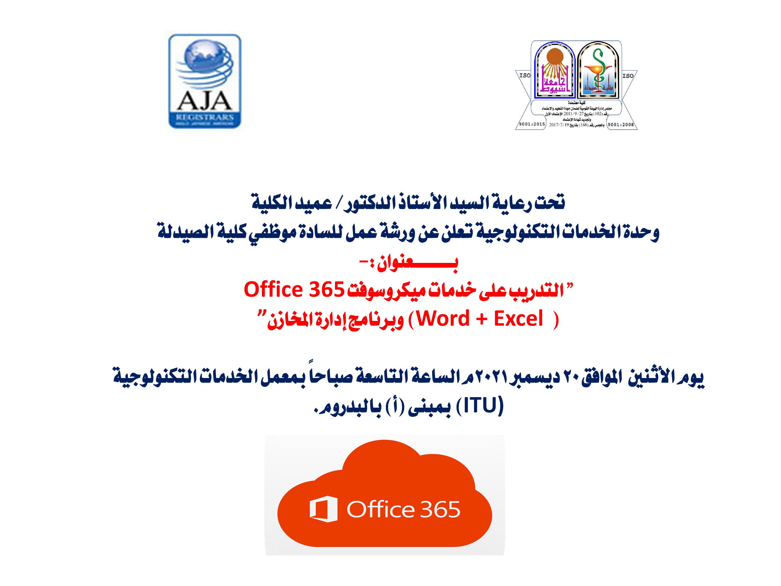 وحدة الخدمات التكنولوجية تعلن عن ورشة عمل للسادة موظفي كلية الصيدلة بــــــــــعنوان:- " التدريب على خدمات ميكروسوفت Office 365 ( Word + Excel ) وبرنامج إدارة المخازن”