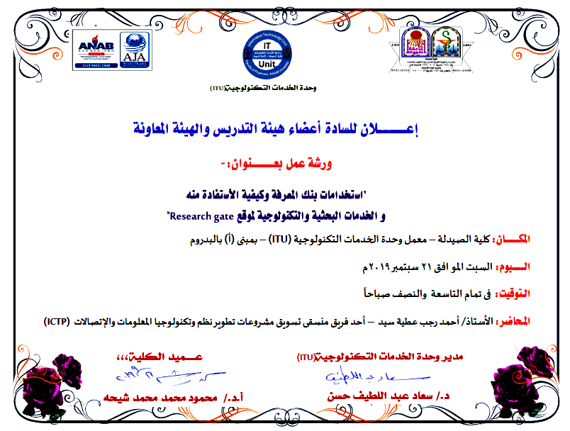 ورشة عمل بعنوان "استخدامات بنك المعرفة وكيفية الاستفادة منه والخدمات البحثية والتكنولوجية لموقع Research Gate" يوم السبت الموافق 21-9-2019م. 18 سبتمبر 2019 ورشة عمل بعنوان "استخدامات بنك المعرفة وكيفية الاستفادة منه والخدمات البحثية والتكنولوجية لموقع Research Gate" يوم السبت الموافق 21-9-2019م.