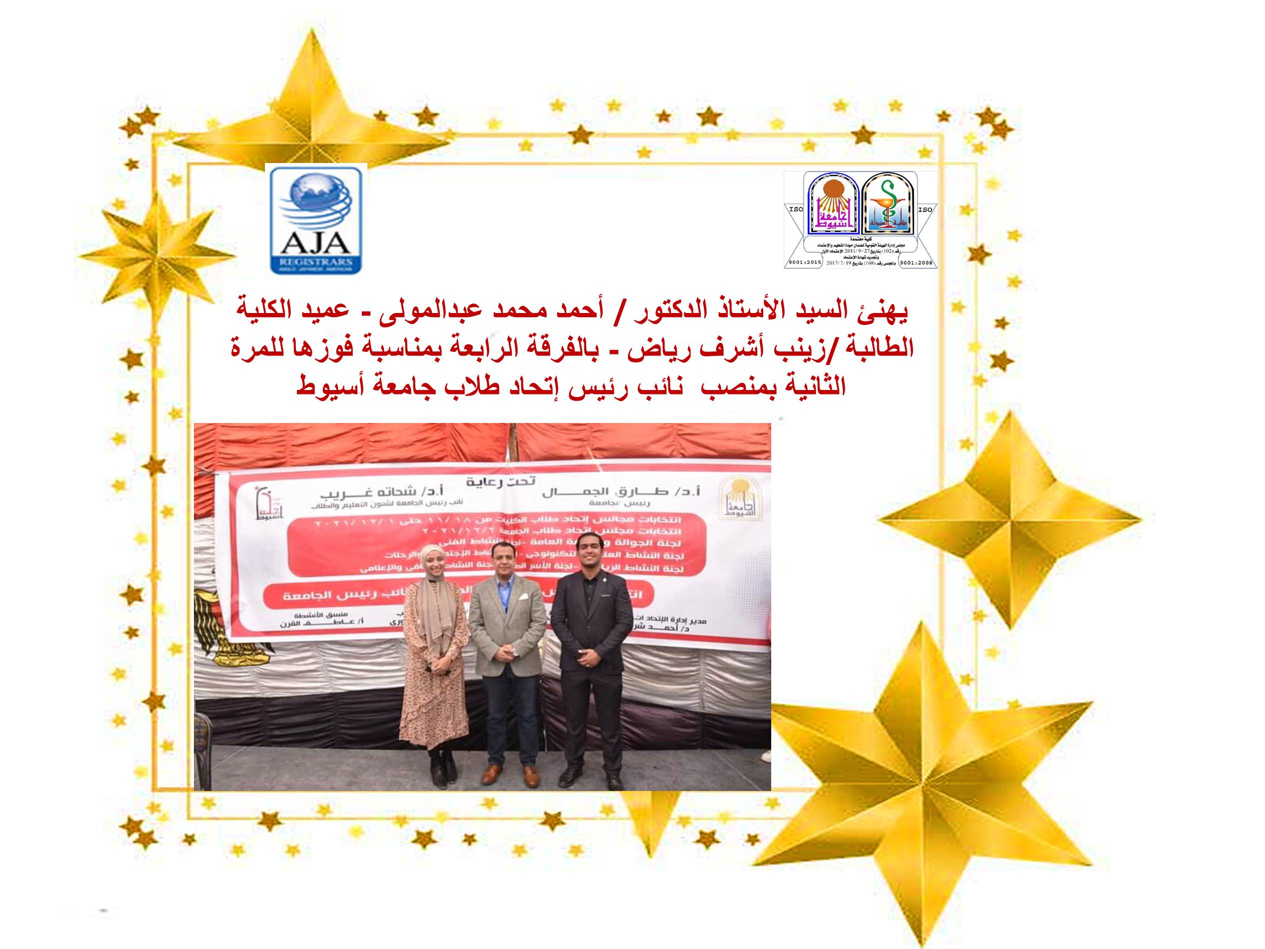 يهنئ السيد الأستاذ الدكتور/ أحمد محمد عبدالمولى - عميد الكلية الطالبة/ زينب أشرف رياض - بالفرقة الرابعة بمناسبة فوزها للمرة الثانية بمنصب نائب رئيس إتحاد طلاب جامعة أسيوط