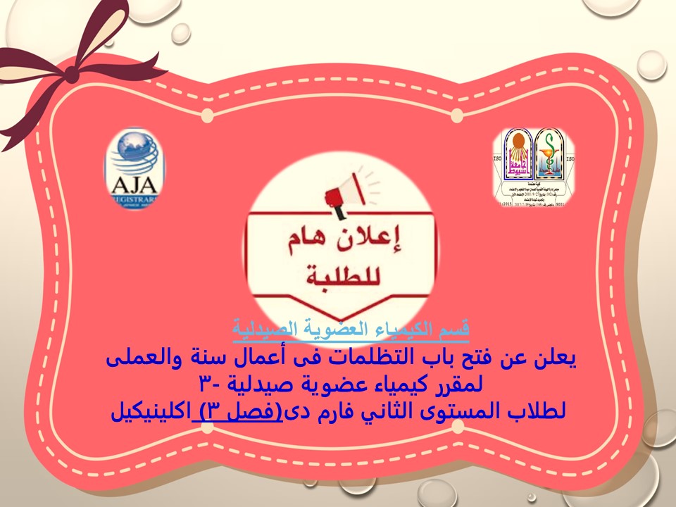 يعلن قسم الكيمياء العضوية الصيدلية عن فتح باب التظلمات فى أعمال سنة والعملى لمقرر كيمياء عضوية صيدلية -3 لطلاب المستوى الثاني فارم دى (فصل 3) اكلينيكيل