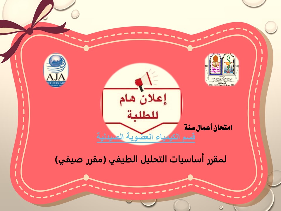يعلن قسم الكيمياء العضوية الصيدلية عن عقد امتحان أعمال سنة لمقرر أساسيات التحليل الطيفي (مقرر صيفي) 21 أغسطس 2022