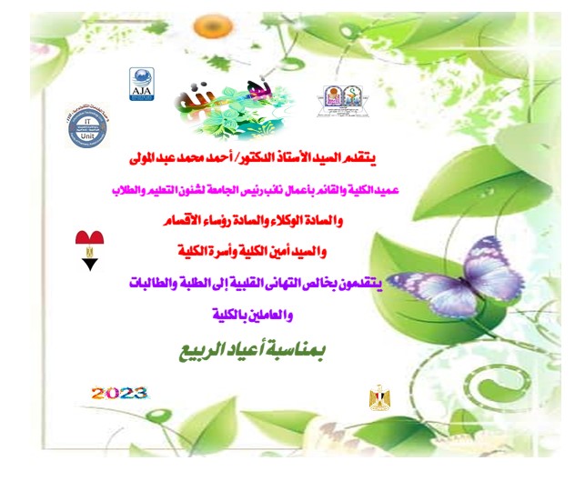 يتقدم السيدالأستاذ الدكتور/ أحمد محمد عبد المولى عميد الكلية والقائم بأعمال نائب رئيس الجامعة لشئون التعليم والطلاب والسادة الوكلاء والسادة رؤساء الأقسام والسيد أمين الكلية وأسرة الكلية يتقدمون بخالص التهانى بمناسبة أعياد الربيع