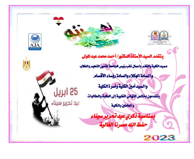 يتقدم السيدالأستاذ الدكتور/ أحمد محمد عبد المولى عميد الكلية والقائم بأعمال نائب رئيس الجامعة لشئون التعليم والطلاب والسادة الوكلاء والسادة رؤساء الأقسام والسيد أمين الكلية وأسرة الكلية يتقدمون بخالص التهانى بمناسبة بعيد تحرير سيناء