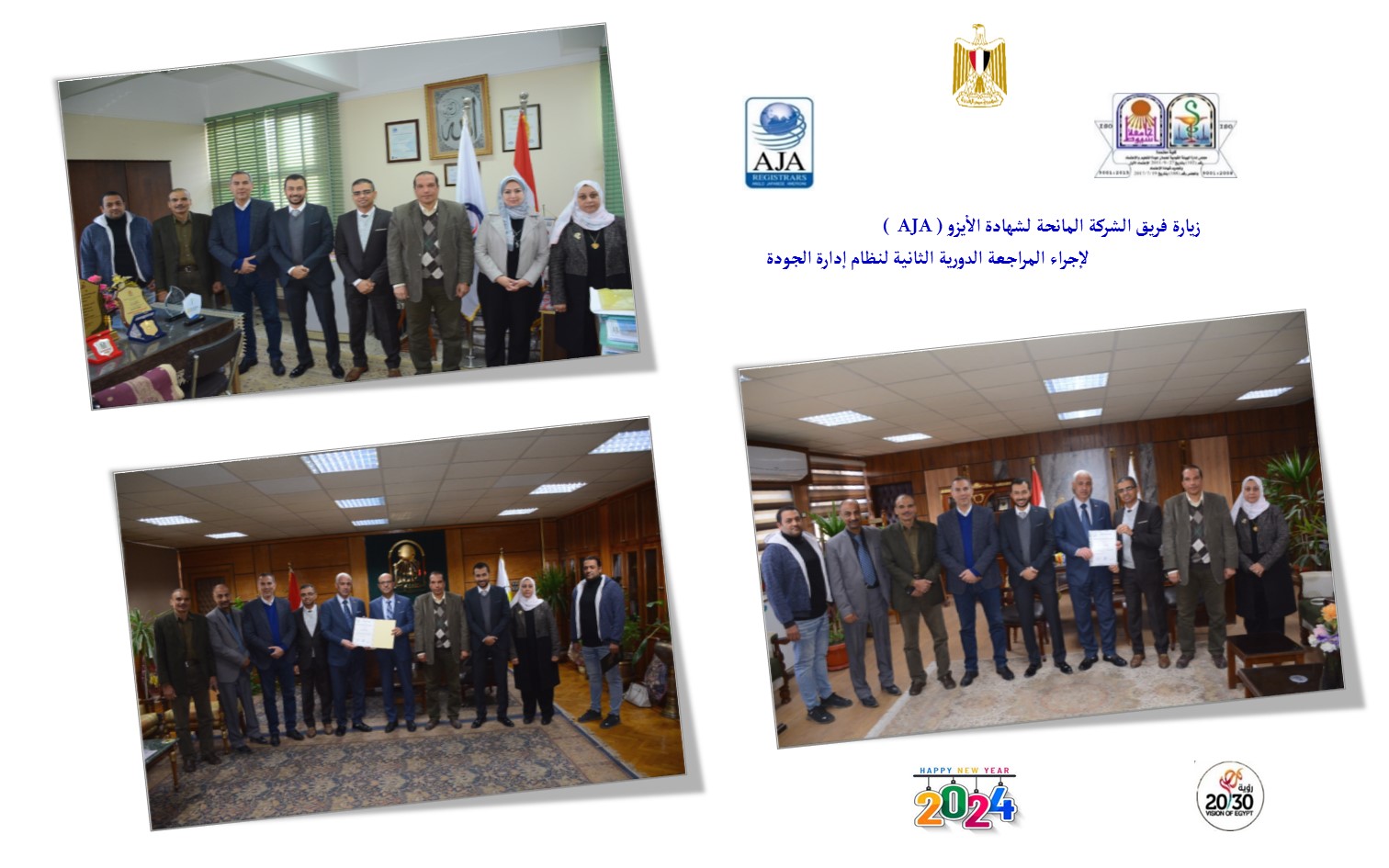 تحت رعاية السيد الأستاذ الدكتور / أحمد المنشاوى - رئيس الجامعة ، والسيد الأستاذ الدكتور / أحمد محمد عبد المولى – عميد الكلية والقائم بأعمال نائب رئيس الجامعة لشئون التعليم والطلاب ، وتحت إشراف السيد الأستاذ الدكتور / حسن رفعت حسن – وكيل الكلية لشئون التعليم والطلاب و مدير وحدة ضمان الجودة و السيدة الأستاذ الدكتور / جيلان عبد الرازق عيد العليم – نائب مدير وحدة ضمان الجودة و بحضور السيدة الأستاذ الدكتور/ جيهان نبيل حسن – وكيل الكلية لشئون الدراسات العليا والبحوث والسيد / طارق سيد حسن أمين الكلية ، زار الكلية فريق الشركة المانحة لشهادة الأيزو ( AJA ) لإجراء المراجعة الدورية الثانية لنظام إدارة الجودة طبقاً لمتطلبات المواصفة القياسية ( ISO 9001:2015 )