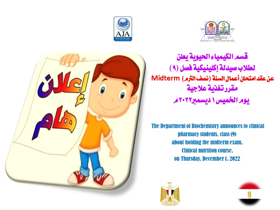 The Department of Biochemistry announces to clinical pharmacy students, class (9) about holding the midterm exam, Clinical nutrition course, on Thursday, December 1, 2022