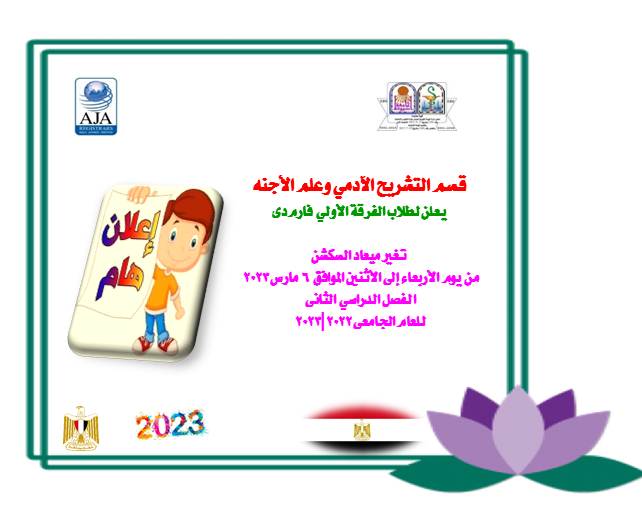 The Department of Human Anatomy and Embryology announces to the students of the first year of Pharm D that the practical lesson date has changed from Wednesday to Monday, March 6, 2023