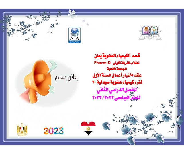 The Department of Organic Chemistry announces to the students of the first year, Pharm-D, Al-Ahlia University, the mid-term exam date for the course of Pharmaceutical Organic Chemistry-2 for the second semester of the academic year 2022/2023