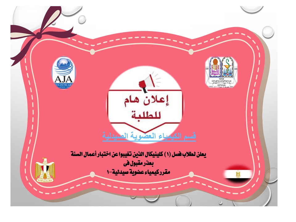 The Department of Pharmaceutical Organic Chemistry announces to students of Class (1) Clinical who are absent from the exam for the mid-term with an acceptable excuse in the course of Pharmaceutical Organic Chemistry-1