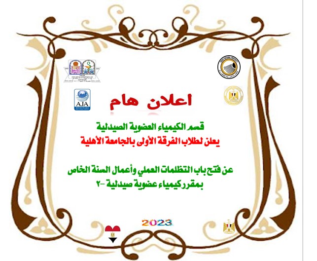 The department of Pharmaceutical Organic Chemistry announces to the students of the first year at Al-Ahlia University the opening of the practical grievances and mid-term exam grades for the course of Pharmaceutical Organic Chemistry-2