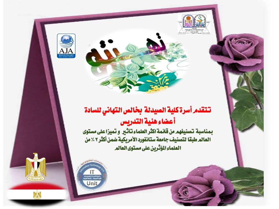 The family of the Faculty of Pharmacy extends its sincere congratulations to the faculty members on the occasion of their classification from the list of the most influential and distinguished scientists in the world according to the classification