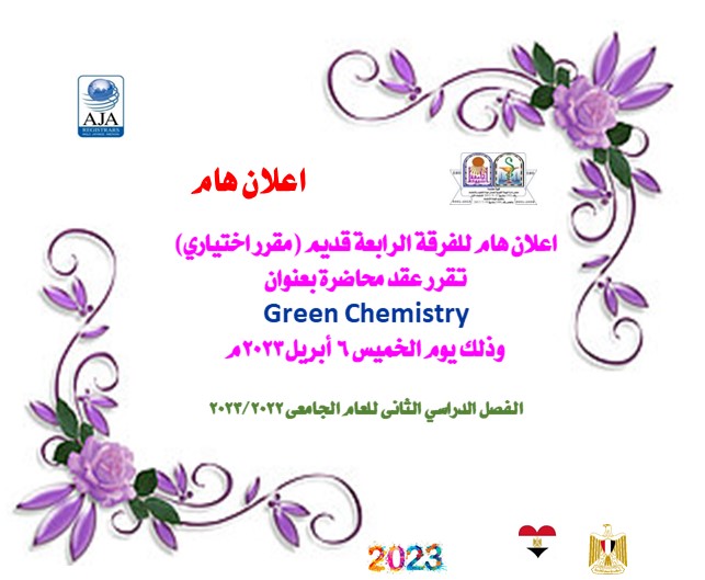 Important Announcement For the fourth year (elective course), it has been decided to hold a lecture entitled "Green Chemistry" on Thursday, April 6, 2023