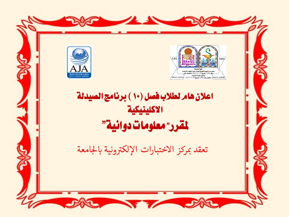 Important Announcement for Students of Class (10) Clinical Pharmacy Program on Monday, April 18, 2022 for the course "Drug Information" 17 April 2022 اضغط قائمة باسماء الطلاب وأرقام الجلوس لمقرر "معلومات دوائية"