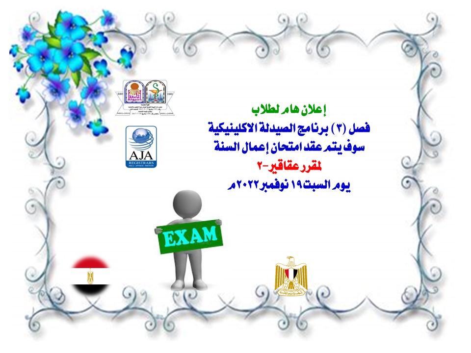 Important Announcement for Students of Class (3) Clinical Pharmacy Program The mid-term exam for Pharmacognosy -2 course will be held on Saturday 19 November 2022