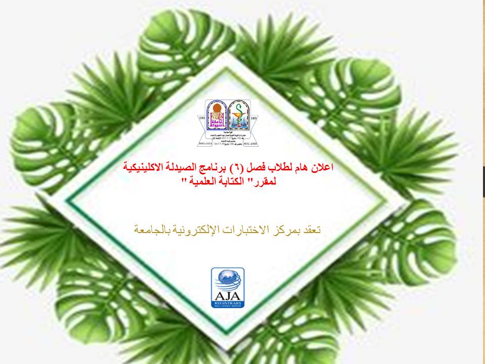 Important Announcement for Students of Class (6) Clinical Pharmacy Program on Sunday, April 10, 2022 for the "Scientific Writing" course 7 April 2022 اضغط قائمة باسماء طلاب فصل (6) لمقرر" الكتابة العلمية "