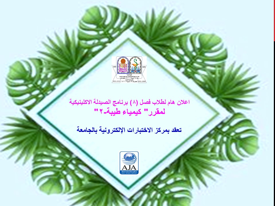 Important Announcement for Students of Class (8) Clinical Pharmacy Program on Saturday, April 16, 2022 for the course " Medicinal Chemistry-2" 14 April 2022 اضغط قائمة أسماء طلاب فصل (8) برنامج الصيدلة الاكلينيكية مقرر " كيمياء طيبة-2"