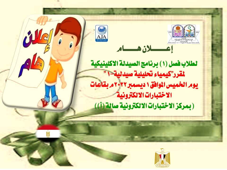An important announcement for students of semester (1) of the clinical pharmacy program for the course "Pharmaceutical Analytical Chemistry-1" on Thursday, December 1, 2022 in the electronic examination halls