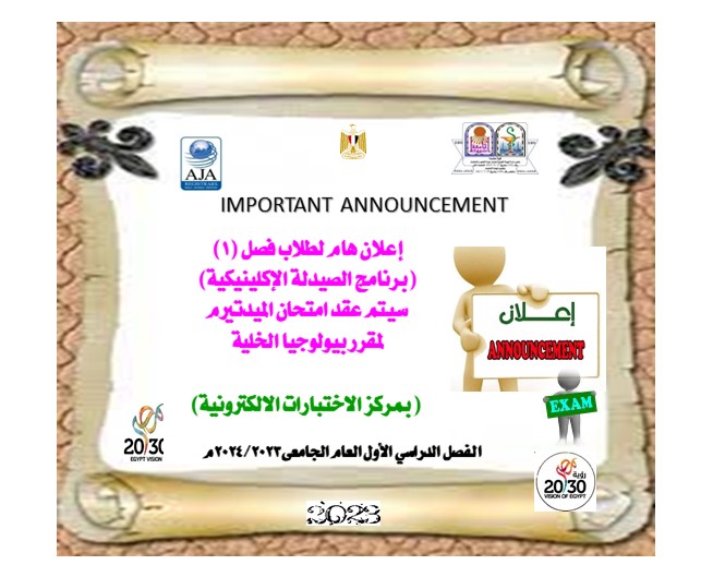 Important announcement for students of Semester (1) of the Clinical Pharmacy Program: The mid-term exam for the cell biology course will be held