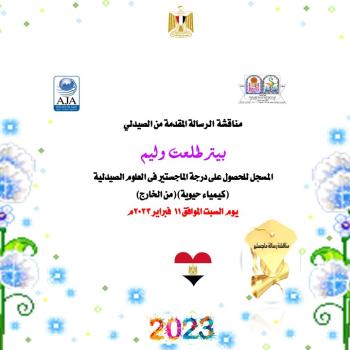 Thesis defense for the pharmacist / Peter Talaat William - registered for a master's degree in pharmaceutical sciences (Biochemistry). This will be on Saturday, February 11, 2023