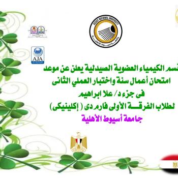 The Department of Pharmaceutical Organic Chemistry announces the date of a mid-term exam and the second practical exam in the part of Dr. Ola Ibrahim - for students of the first year, Pharm D (Clinical), Assiut Ahlia University